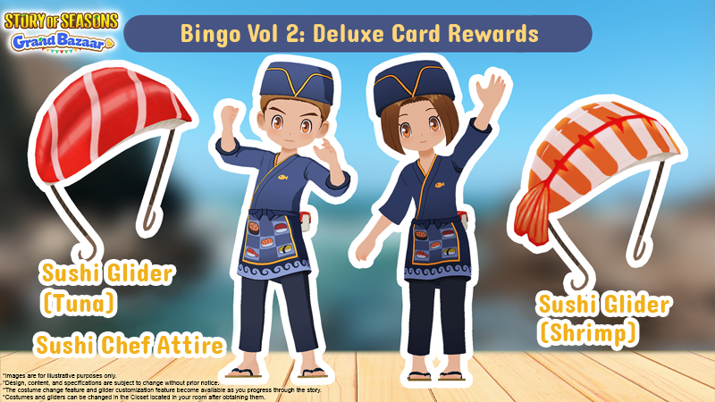 Le dernier volume de Happy Bingo, un mini-jeu récompensant les joueurs avec des objets et des éléments cosmétiques, est également disponible dès aujourd’hui. Il fait partie d’une mise à jour gratuite pour STORY OF SEASONS: Grand Bazaar sur PC, Nintendo Switch™ et Nintendo Switch 2™. Trois nouvelles cartes proposant diverses activités permettront aux joueurs de gagner des éléments cosmétiques inspirés des saveurs de l’océan, tels que la casquette de chef sushi, le tablier de chef sushi, le planeur sushi (thon) et le planeur sushi (crevettes).